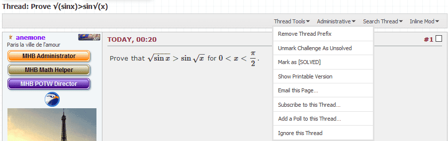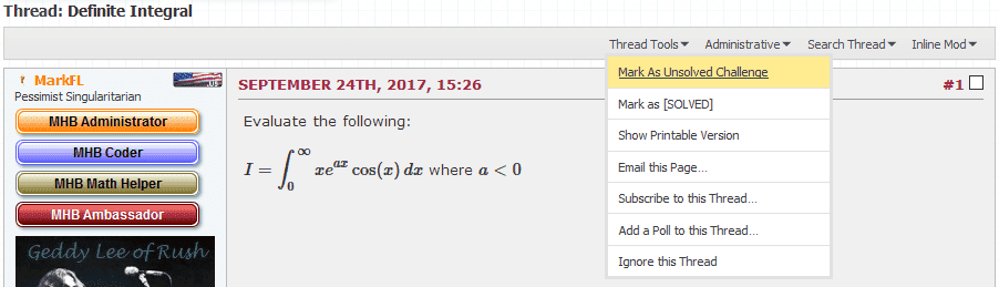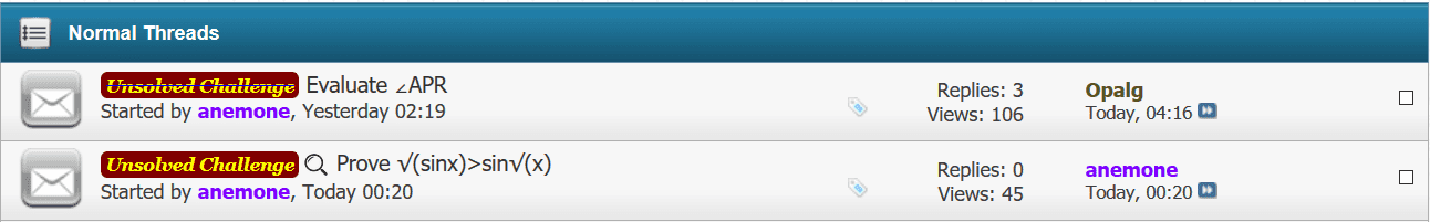 This forum is for the posting of problems and puzzles which our members find challenging, instructional or interesting and who wish to share them with others. As such, the OP should already have the correct solution ready to post in the event that no correct solution is given within at least 1 week's time. The only exception to the rule that the OP have a solution to the problem is in the case where an "Unsolved Challenge" is being posted. These will be carefully monitored to ensure this feature is not being abused, that is, used as a means of getting help without showing effort.