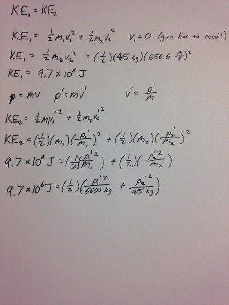 The discussion revolves around a problem involving a projectile fired from a gun, comparing scenarios with and without recoil. The original poster presents a situation where a 45 kg projectile is fired at a speed of 656.6 m/s from a gun with a mass of 6600 kg, seeking to determine the muzzle speed when the gun is free to recoil.