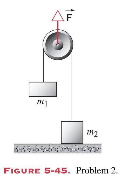 - Someone exerts a force F directly up on the axle of the pulley shown in Fig. 5-45. Consider the pulley and string to be massless and the bearing frictionless. Two objects, m1 of mass 1.2 kg and m2 of mass 1.9 kg, are attached as shown to the opposite ends of the string, which passes over the pulley. The object m2 is in contact with the floor. (a) What is the largest value the force FB may have so that m2 will remain at rest on the floor? (b) What is the tension in the string if the upward force F is 110 N? (c) With the tension determined in part (b), what is the acceleration of m1?