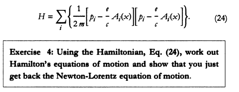 the Hamiltonian of a charged particle in a magnetic field(ignore the electric field) is $$H=\sum_{i} \left\{ \frac{1}{2m} \left[ p_{i}-\frac{e}{c}A_{i}(x) \right]\left[ p_{i}-\frac{e}{c}A_{i}(x) \right] \right\},$$and$$p_{i}=m\dot x_{i}+\frac{e}{c}A_{i}(x)$$and Hamilton's equations of motion is $$\dot q_{i} = \frac{\partial H}{\partial p_{i}}$$$$\dot p_{i} = -\frac{\partial H}{\partial q_{i}}$$then I solve these equations in x. $$\dot x = \frac{\partial H}{\partial p_{x}} = \frac{p_{x}-\frac{e}{c}A_{x}}{m}$$and$$\dot p_{x}=m\ddot x + \frac{e}{c}\left( \frac{\partial A_{x}}{\partial x}\dot x+\frac{\partial A_{x}}{\partial y}\dot y+\frac{\partial A_{x}}{\partial z}\dot z \right)$$$$-\frac{\partial H}{\partial x}=-\left[ \frac{p_{x}-\frac{e}{c}A_{x}}{m}(-\frac{e}{c}\frac{\partial A_{x}}{\partial x})+\frac{p_{y}-\frac{e}{c}A_{y}}{m}(-\frac{e}{c}\frac{\partial A_{y}}{\partial x})+\frac{p_{z}-\frac{e}{c}A_{z}}{m}(-\frac{e}{c}\frac{\partial A_{z}}{\partial x}) \right]=\frac{e}{c}\left( \frac{\partial A_{x}}{\partial x}\dot x+\frac{\partial A_{y}}{\partial x}\dot y+\frac{\partial A_{z}}{\partial x}\dot z \right)$$then$$m\ddot x + \frac{e}{c}\left( \frac{\partial A_{x}}{\partial x}\dot x+\frac{\partial A_{x}}{\partial y}\dot y+\frac{\partial A_{x}}{\partial z}\dot z \right)=\frac{e}{c}\left( \frac{\partial A_{x}}{\partial x}\dot x+\frac{\partial A_{y}}{\partial x}\dot y+\frac{\partial A_{z}}{\partial x}\dot z \right)$$and get $$ma_{x}=\frac{e}{c}(B_{z}\dot y-B_{y}\dot z)$$