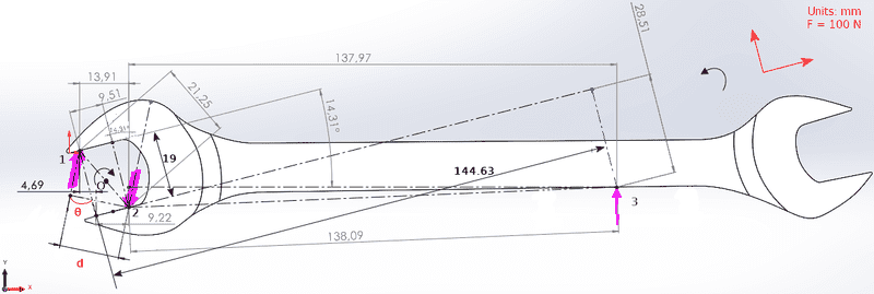 I' m trying to make a linear static analysis (Finite Element Analysis) on the following hand tool. I want to determine the boundary conditions. In order to do that I have decided to use a force couple to represent the forces that a bolt exerts on the jaws of this spanner.