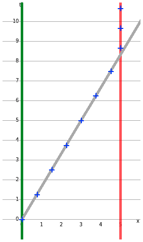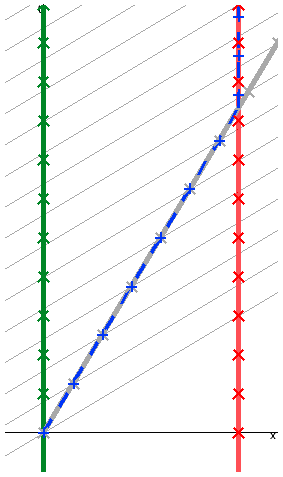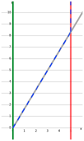 Things that have constant positions in space appear as vertical lines here, because their x position is the same at all times. The green line represents Earth and the red line represents Mars. Things that are moving are slanted lines, and the Enterprise appears as a grey line, initially in the same place as Earth at the bottom of the diagram and, as time goes on, moving towards Mars and arriving there after about eight time units. Mr Spock's path is marked as a blue dotted line, travelling with the Enterprise until they reach Mars, where he stays. Finally, there are some fine horizontal grid lines to help with reading this frame's time.