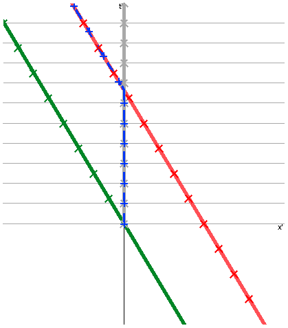 The grey lines go through each of Enterprise's clock ticks, just as the ones in the earlier diagrams go through each of Earth's clock ticks. But, in this frame, those lines are slanted. Enterprise does not divide spacetime into space and time in the same way as Earth does. And notice how the lines compare to the green markers of Earth's clock ticks. The first Earth tick is after the first line, and the fourth Earth tick is on the fifth grey line - just like the Enterprise's ticks were on the Earth's grey lines. The slant of those lines is what I called "the relativity of simultaneity" in an earlier post - the two frames don't agree what parts of spacetime are "at the same time" - one frame uses the horizontal lines and one the slanted lines.