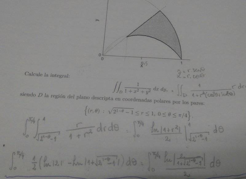 I tried to do it in polar coordinates, so I substituted x=r.cos(Θ) y=r.sin(Θ) in the function, I know the answer for the first integral will be ln (1+r^2)/2, but I don't know what should I do with that theta as an exponent of two, inside of a function with a squared root xP. Thank you