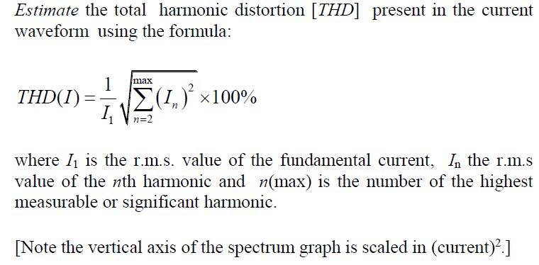 Estimate the total harmonic distortion [THD] present in the current waveform using the formula: