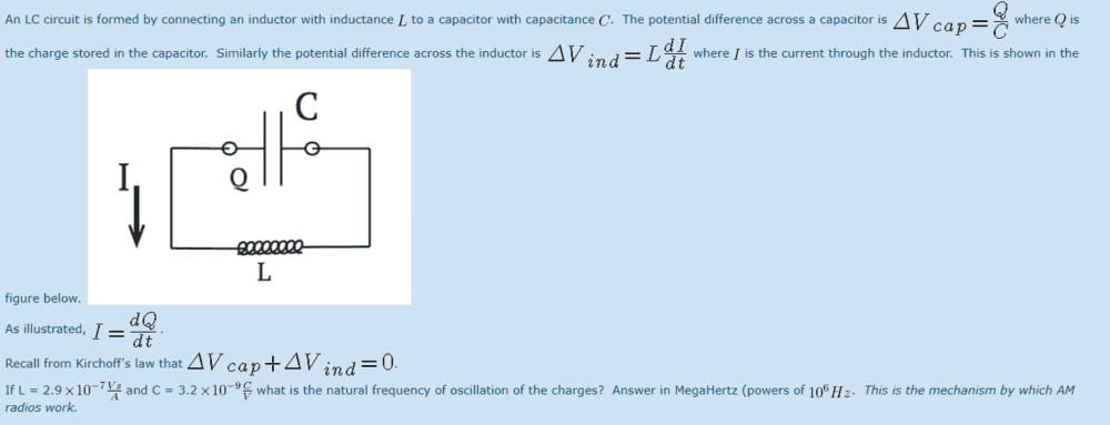 Now my issue is using this w gives the wrong frequency (the frequency is supposed to be 5.22 in MegaHertz). I obviously didnt use the first part of the equation with Q/C in any manner. I don't see how I can use Q/C in the harmonic motion equation with L d^2Q/dt^2 to find a different w.