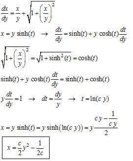 Another way is to solve it as an implicit equation. Introduce p = dx/dy, and z = x/y. Then: