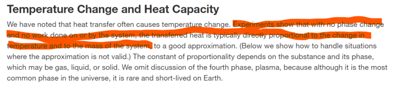 The heat added to the system is proportional to the mass. Does someone please know how that highlighted statement is so? I think it is because the heat increases the internal energy of a system and internal energy is the sum of the translational, rotational, and vibrational kinetic energies and also potential energy (I'm not sure what types thought). Therefore, the mass of the system should increase since the particles will have more mechanical energy.