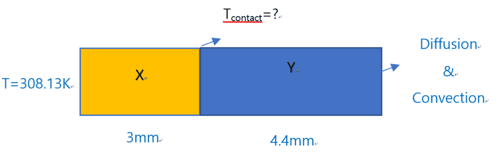 There is given a rectangular bar which is composed of two different materials, X and Y. Cross-section is 1mm width, 1mm of thickness and 3mm length for material X and 4.4mm length for material Y. Assume that all the sides are thermally insulated except left side of the bar where material X has temperature of 308.13K and ambient T=283.13K and right surface of the bar where Y material experiences diffusion and convection . X and Y materials have thermal conductivities of 0.3 W/mK and 0.014W/mK, respectively. Surface emissivity (ε=0.9) and convection ht coefficient h=2W/m^2K. We need to find contact surface temperature.