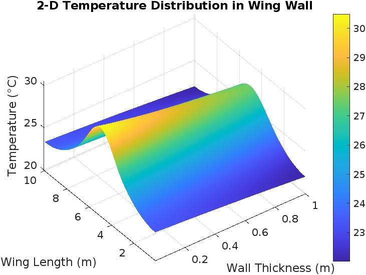 So far what I've done is try to model this as a 2D planar wall, but simulating the hot impinging air jets by having a localized higher convection coefficient where the jets are directly pointed towards, then exponentially decreasing the convection coefficient away from the jet streams so that my model shows much higher temps where they are pointed directly - which agrees with the research papers I've read that have done the 3D analysis. In your opinion, is this reasonable? Is there a better geometry to use here? I have attached an output figure I got from MATLAB (I used the wing thickness as 1m just to see if my code was actually calculating the conduction through the wing, obviously it will be a lot thinner).