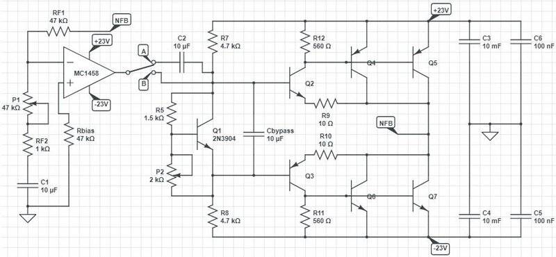 When I checked only output power stage with VBE multiplier (without MC1458 op-amp) everything worked just fine. But when I connected op-amp to it directly (no AC coupling - switch position B), as I increased Vce of VBE multiplier just a tiny bit, then the current through both upper and lower output power quadrants suddenly increased to 2A or more and stayed there or it was swinging like there was some kind of heavy oscillation within amplifier! As soon as I added AC coupling capacitor (switch position A), the darn thing worked as expected when Vce of VBE multiplier was changed! As it was increased with potentiometer P2 slightly also the quiescent current through power stage increased slightly - as expected!