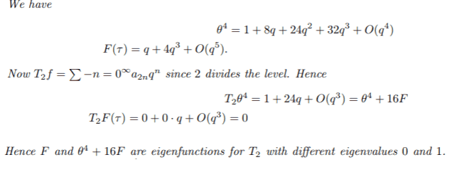 Consider the action of ##T_2## acting on ##M_k(\Gamma_{0}(N)) ##, and show that ##\theta^4(n)+16F ## and ##F(t)## are both eigenfunctions.