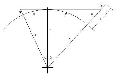 h = ((SQRT(d1^2+R^2)-R))-((SQRT(d2^2+R^2)-R))-