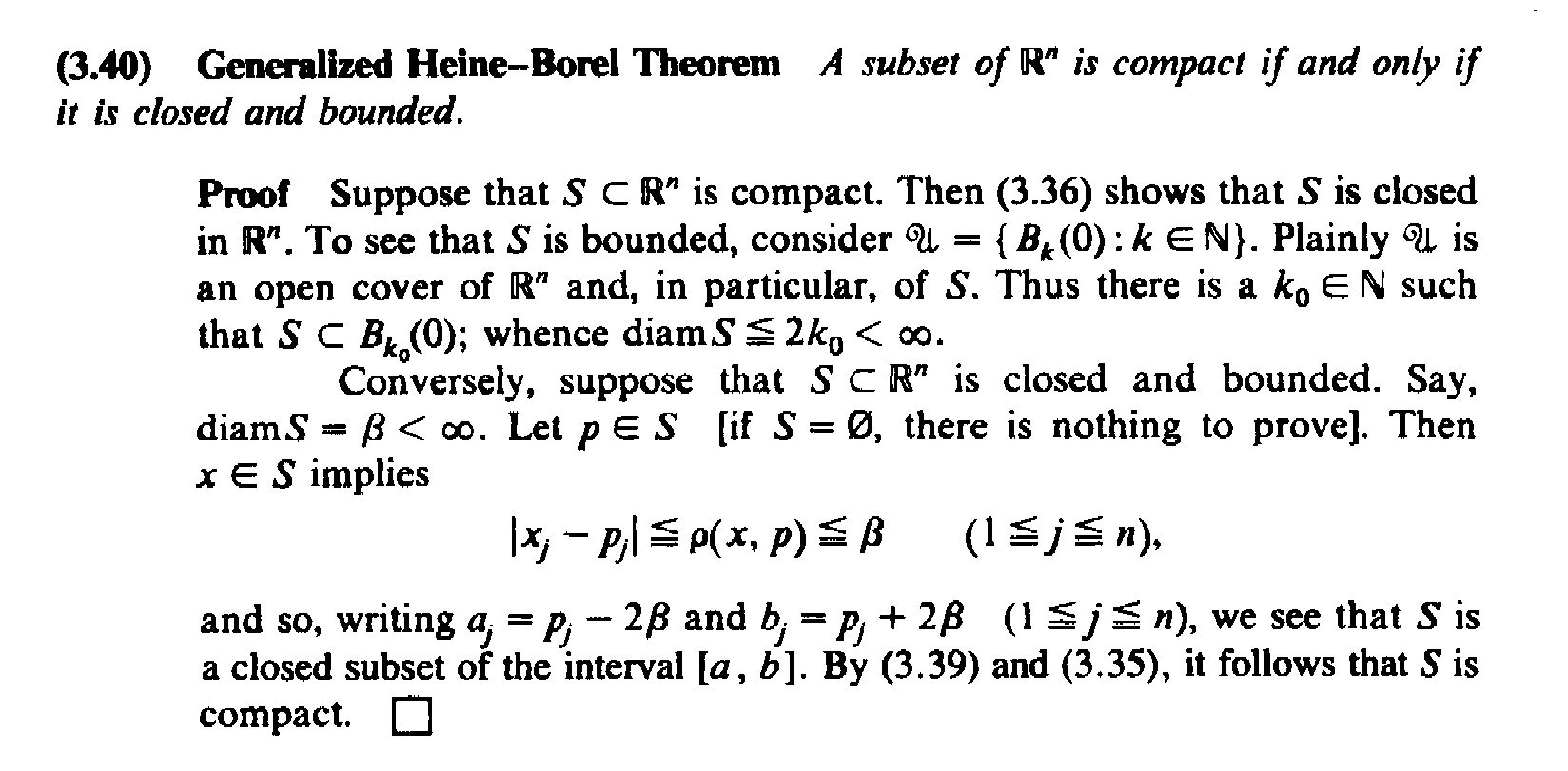 " ... ... To see that $$S$$ is bounded, consider $$\mathscr{U} = \{ B_k (0) \ : \ k \in \mathbb{N} \}$$. Plainly $$\mathscr{U}$$ is an open cover of $$\mathbb{R}^n$$ and, in particular of $$S$$. Thus there is a $$k_0 \in \mathbb{N}$$ such that $$S \subset B_{ k_0 } (0)$$; whence $$\text{diam}S \leq 2 k_0 \lt \infty$$. ... ... "
