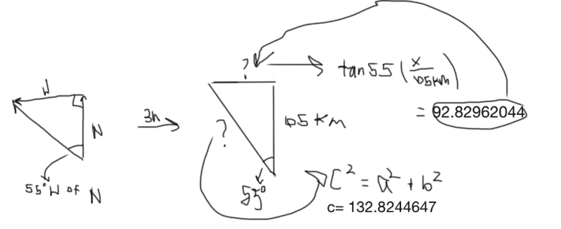 The discussion revolves around a problem involving vector components related to a ship's velocity, specifically its direction and distance traveled over time. The ship is described as traveling at an angle of 55 degrees west of north and covers a distance of 65 km in 3 hours.