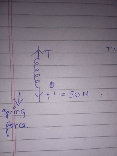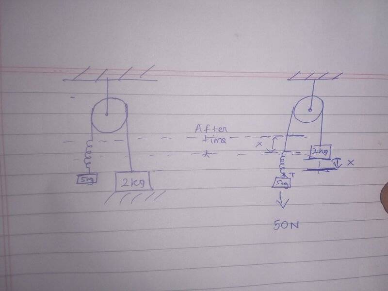 Can someone walk me through what exactly would happen when the system is released from rest. Mainly im concerned about the 5kg block when it moves down by say a distance x, this means the gravitational force is more than the tension in the string above, but due to this tension the spring will elongate, but the upper part of the spring is not connected to a fixed support so it will accelerate downwards as well, making the elongation 0 hence the spring force 0? So what is the tension in the string connecting the 2kg block and the spring...