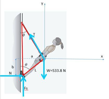 - I think It will be best to use her foot contacting the wall as the origin to eliminate the Fs and FN from the torque equations, but that still leaves me with tension as an unknown.