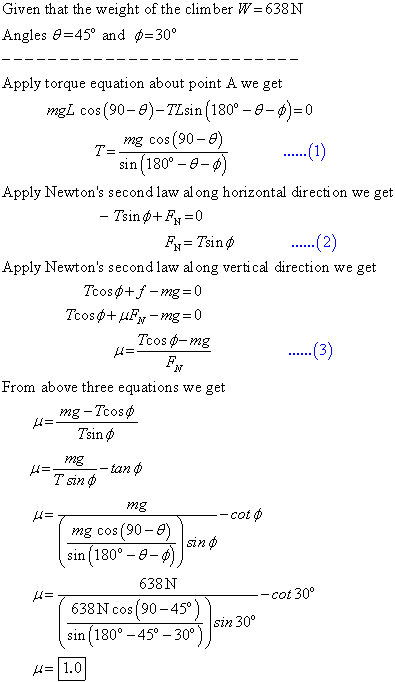 A climber with a weight of 533.8 N is held by a belay rope connected to her climbing harness and belay device; the force of the rope on her has a line of action through her center of mass. The indicated angles are 30 degrees(top) and 40 degrees(bottom). If her feet are on the verge of slipping on the vertical wall, what is the coefficient of static friction between her climbing shoes and the wall?
