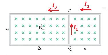 - The circuit in the figure below is located in a magnetic field whose magnitude varies with time according to the expression ##B=1.00\times10^{-3}t##, where ##B## is in teslas and ##t## is in seconds. Assume the resistance per length of the wire is ##0.094## Ω/m. Find the magnitude of the current in section ##PQ## of length ##a = 55.0## cm, and its direction.
