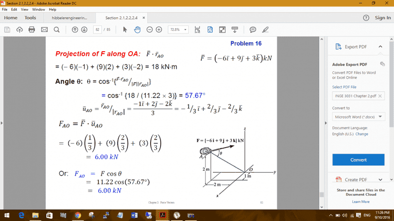 I thought that since I'm given the force F in cartesian form, that I would need to calculate the component of the force F on the line AO and then use the cos(theta)=(A*B)/(|A|*|B|) but that's not at all what my professor did or what I see other people doing.