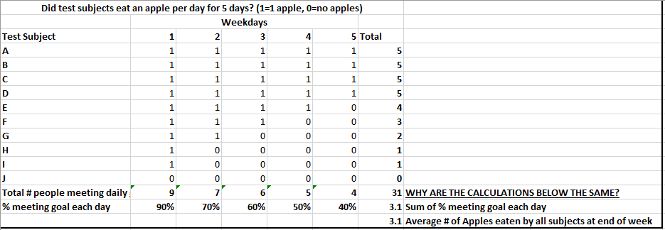 Scenario: A group of 10 people are asked to attempt eating at least 1 apple each day for 5 days. At the end of 5 days, the researcher looks at the data to determine what percentage of the group met the goal each day, as well as the total number of apples eaten by each test subject over the 5 day period. When I sum the % of total test subjects who ate an apple each day and also average the total number of apples eaten over the week by all subjects, the results are the same. The calculated data is pasted below.