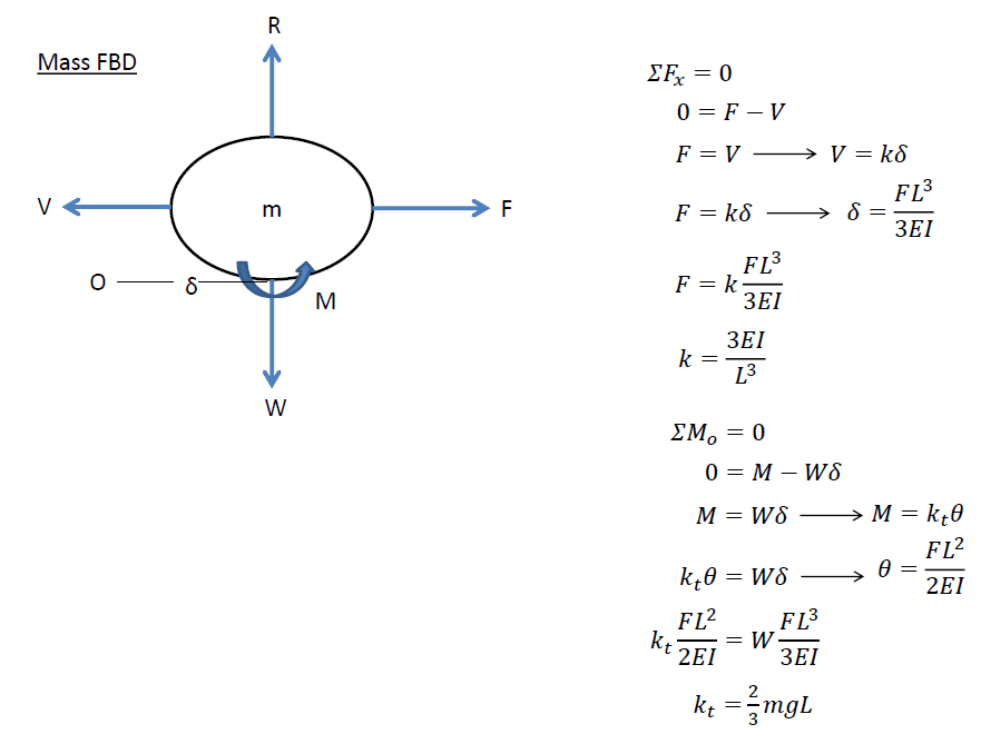 So I was trying to learn how to build a mathematical model of an oscillating system. The system and FBD is shown below. I just got confused why I got a different value of k from both x force and torsional equilibrium equation? Am I missing something?