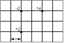 Three charges are fixed in place as shown. The squares in the grid have sides of length s = 0.24 m. The magnitude of q is 3 mu or micro Coulombs (1 mu or micro Coulomb = 10-6 Coulombs), while the magnitude of Q is 4.5 mu or micro Coulombs. What is the magnitude of the net force on q due to the other two charges?