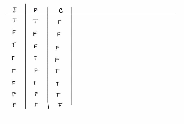 I've attached an image of my truth table, but I don't think it's correct as in none of the cases are all three of my premises true.