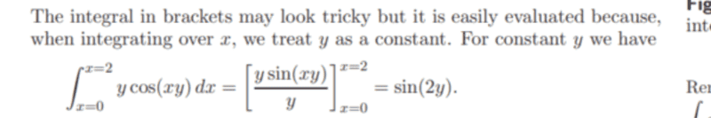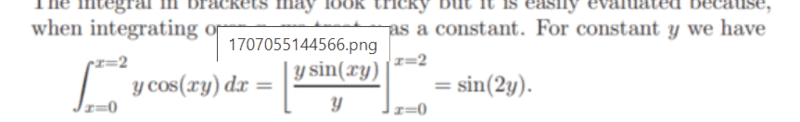 - One participant expresses difficulty in understanding the transition from sine to cosine in the context of integration, specifically regarding the integral $$\int_{x=\pi/2}^\pi \sin(2y)~dy$$ and its evaluation.