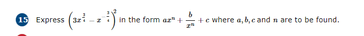 That is not correct. You can not simply square the individual terms. Do you know what the general result of ##(a-b)^2## is? Multiply out the square to see what is right.homeworkhelpls said:View attachment 31519615) here i did 9x^3/2 - 1/x^3/2 to get 9x^9/4 - 1/x^3/2 but that's not in the right form, how do i do it correctly?