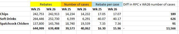 Between week 25 and week 26 my overall rebate per case dropped from £16.30 to £15.96 which has a financial impact of 13,566. I know this is the right number as it takes into account variation on rebate per case and the number of cases ordered but it is the same calculation in the individual ingredient rows above but they don't add up to this total.