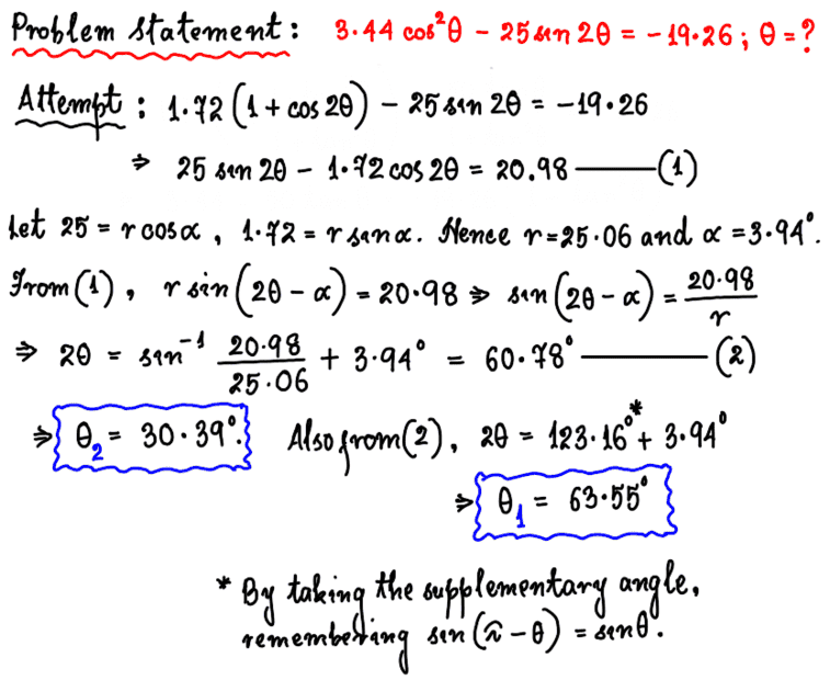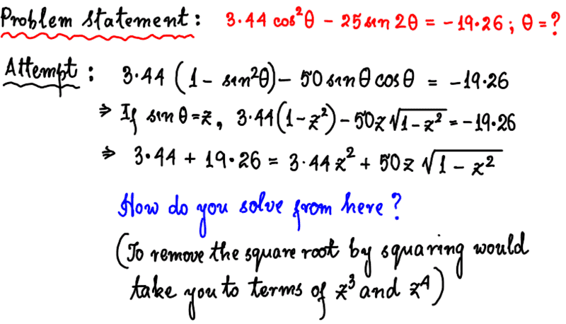 The forum discussion centers on solving the trigonometric equation ##3.44\cos^2\theta-25\sin 2\theta=-19.62##. Participants suggest various methods, including substituting ##\sin^2{\theta}=1-\cos^2{\theta}## and using the identity ##\sin(2\theta)=2\sin{\theta}\cos{\theta}##. The final solutions presented are ##\theta_1 = 62.7^{\circ}## and ##\theta_2 = 31^{\circ}##, with the possibility of adding multiples of ##180^{\circ}## to these angles. The discussion emphasizes the importance of algebraic manipulation and the use of trigonometric identities in solving such equations.