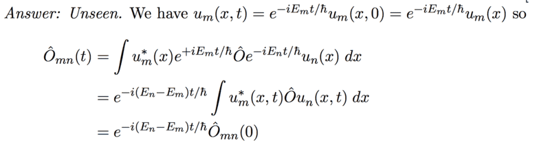 The discussion clarifies the interpretation of the quantum mechanics problem regarding the operator O(t) and its relation to eigenstates at time t=0. It emphasizes that O(t) does not need to be evaluated at t=0, but rather in terms of the eigenstates defined at that initial time. Additionally, it corrects a notation error in the answer, specifying that the terms should be um*(x) and un(x) without t dependence.