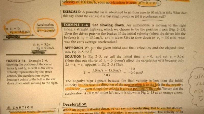In an example in my book, a problem reads that a car is moving in the positive x direction, the initial velocity is 15m/s and it takes 5 seconds to slow down to 5m/s. The example tells me the cars average acceleration is -2m/s^2. Then it says that in this case the acceleration is to the left, in the negative x direction evn though the velocity is pointing right. (I assume they mean instantaneous velocity) Now what I don't understand is how can the velocity be moving in the positive x direction but have a negative magnitude? If v1= 15 and vf=5, then the average v= -10. so if the signs tells us where the direction is, and this says it's negative, why is it moving in the positive x direction?