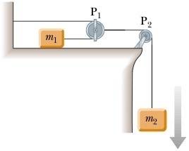 An object of mass on a frictionless horizontal table is connected to an object of mass m2 through a very light pulley P1 and a light fixed pulley P2. (a) If a1 and a2 are the accelerations of m1 and m2, respectively, what is the relation between these accelerations? Express (b) the tensions in the strings and (c) the accelerations a1 and a2 in terms of the masses m1 and m2, and g.