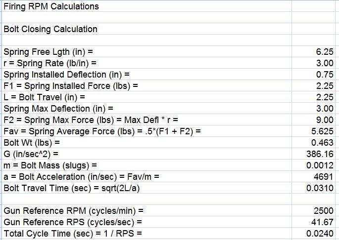 The discussion revolves around calculating the cyclic rate of a semi-automatic firearm's bolt mechanism. Participants explore the relationship between the bolt's mass, travel distance, and the forces involved in regulating its speed, particularly in the context of reducing the cyclic rate from 2500 RPM to between 900 and 1000 RPM.