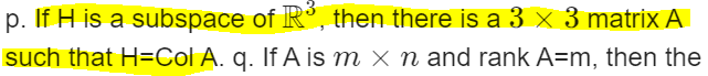 1. So for problem 1, I can first tell you what I know about subspaces. I understand that a subspace is a vector space that consists of a subset of vectors from a larger vector space (##R^n## in this case I guess) and that there are three properties a subspace have. I also know that the basis of the subspace is the set of linearly independent vectors that spans H. The dimension of the subspace H must be equal to or less than the dimension of the vectorspace it is the subspace of. But what is the relation between the subspace and col(A)? The only thing that my book says about col A is that the pivot columns of a matrix A forms the basis of col A. I don't understand this problem at all, and don't know if the statement is true or false.