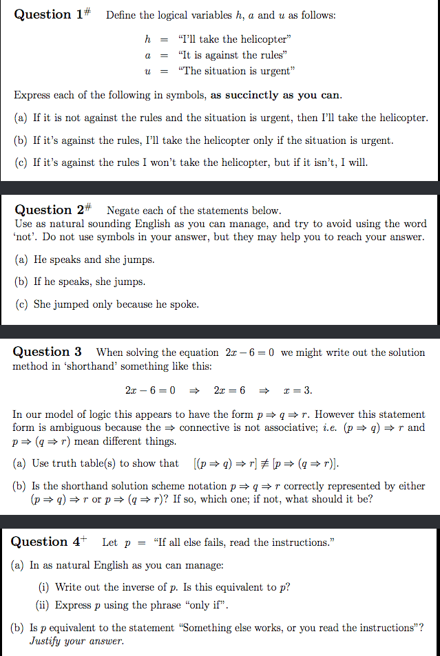 c) a ⇒ ¬h ⊕ ¬a ⇒ h