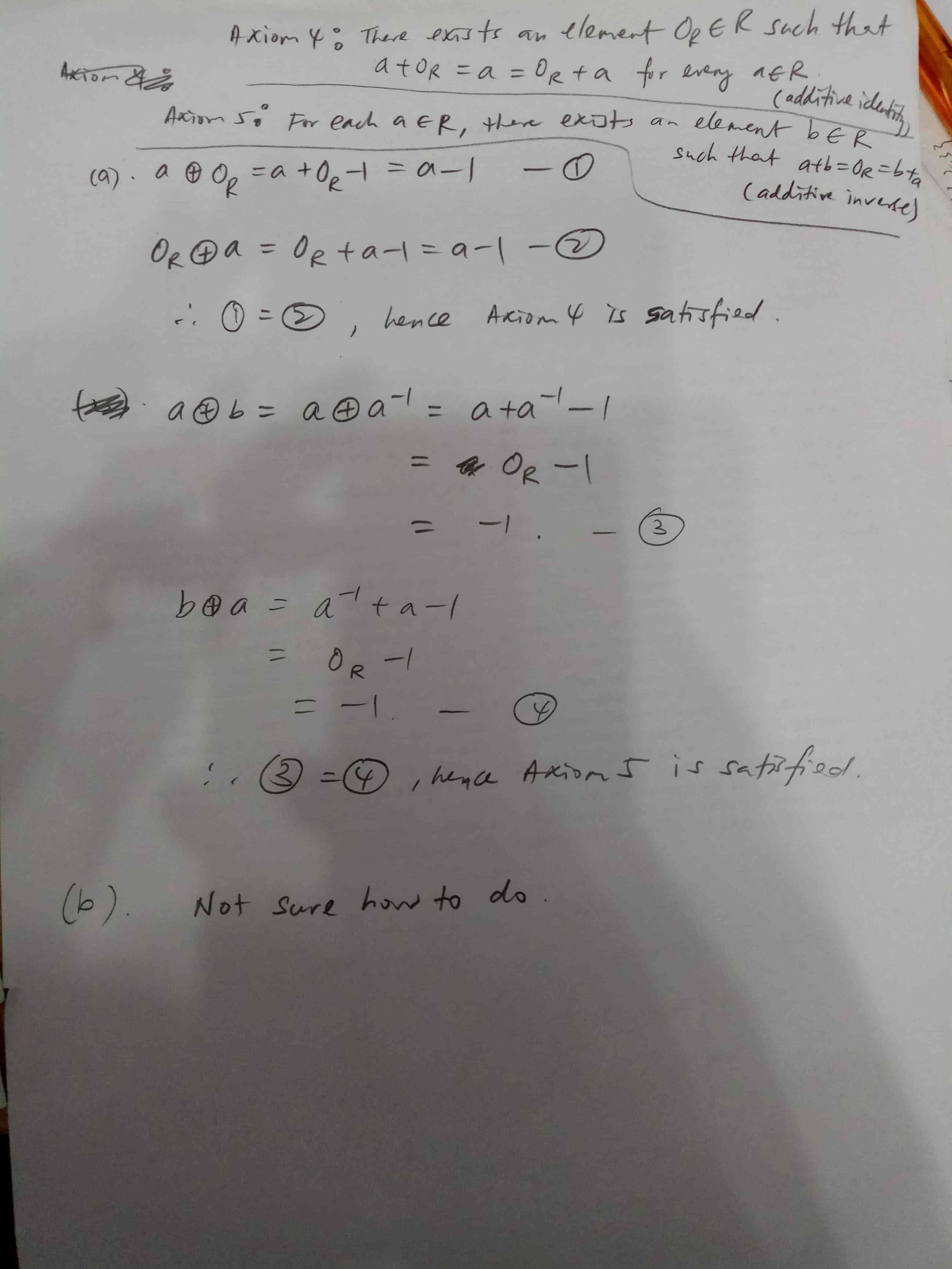 The discussion focuses on the mathematical concepts related to the operations defined in a ring structure, specifically addressing parts (a) and (b) of a question involving the identity element and multiplicative properties. The correct identity element for addition in the ring is established as $O_R = 1$, contradicting the initial assumption of $O_R = 0$. For part (b), it is concluded that if $a\odot b = 1$, then either $a = 1$ or $b = 1$, demonstrating the multiplicative identity properties within the ring.