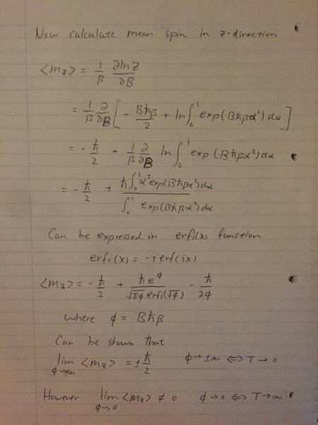 My second question becomes apparent if you take a quick look at the images I've attached (end of part 2). Essentially I found that the average spin derived from the partition function did converge to +1/2 and -1/2 as the temperature went to zero, however I got a non-zero value as the temperature went to infinity.