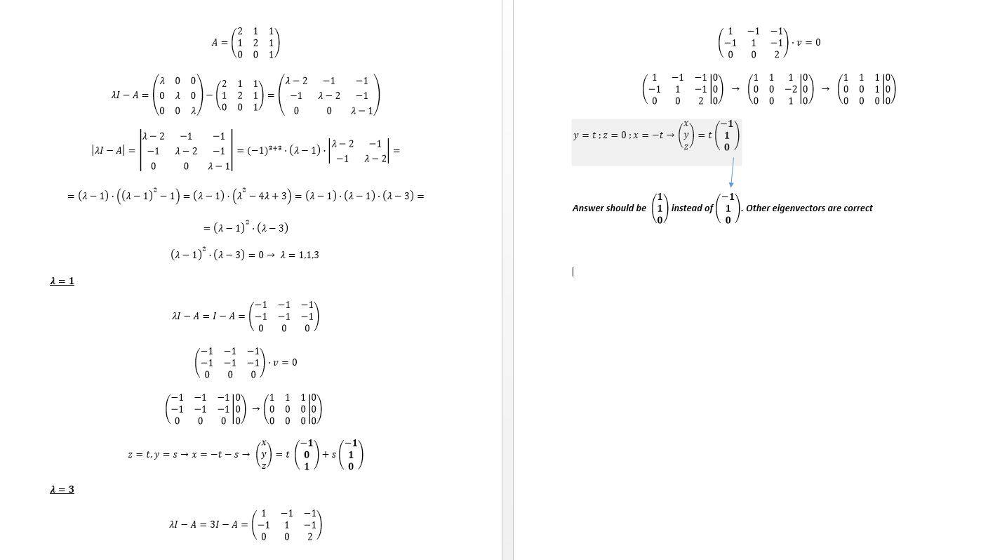 For the first eigenvalue I got identical eigenvectors in both methods, but for the second eigenvalue, the first method was wrong, while the second was correct. I can't find the problem. I am attaching my solution using
