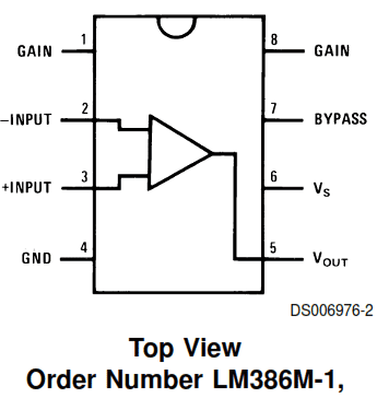 The image below is from the datasheet for the LM386 made by National Semiconductor. As you can see, the supply voltage is on pin 6, Ground is pin 4, and -Input is pin 2. Your circuit has pin 2 connected to Ground, probably as a short circuit trace between pins 2 and 4. I said pin 4 for the bypass capacitor just to be very safe (conservative). If there is a bad connection on the board between pins 2 and 4, the bypass might not connect to Ground if soldered to pin 2.