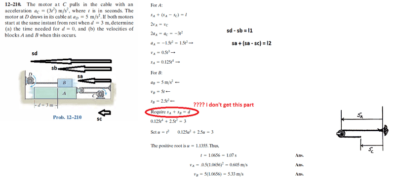The discussion centers on the constraint equations for two blocks, A and B, and how their movements relate to the distance d. When block A moves, it travels a distance of d=3 meters, making sa=d and sb=0, while the opposite holds true when block B moves. The participants agree that the equation sa + sb = d is valid through superposition, but question whether it should instead be expressed as deltaSa + deltaSb = d due to the measurement from the datum. The clarification arises that while the definitions of sa and sb are positive, the diagram suggests that sb should be negative, leading to the equation sa - sb. Ultimately, the method remains correct despite the potential confusion in the notation.