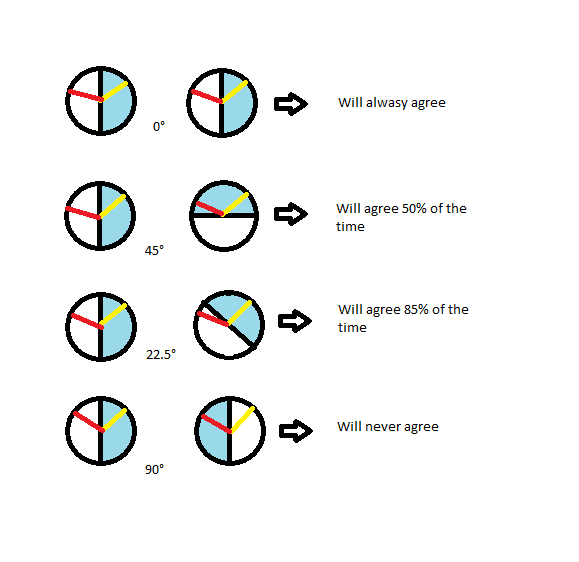 The only nuance is that the angle inclination is not linear: so at 0 degrees the two horizontals are the same, but at 45 degrees the horizontal are perpendicular, at 22.5 it is at 15 degrees from the horizontal, and so on. The important point is that the probability is given by the overlap of the blue areas. (note that here the 22.5 is not the correct angle only for ease of drawing)