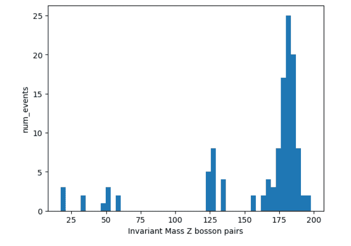 For your convenience, I attached two of my histograms- one for Z boson pairs invariant mass (i.e came from the same decay) and the second is the invariant mass of a single Z boson invariant mass. The invariant mass is in GeV units.