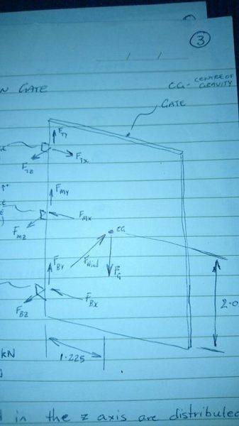 - Some participants express uncertainty about how to account for the wind force acting on the gate, which has been approximated as a force of 7100N through the center of gravity.