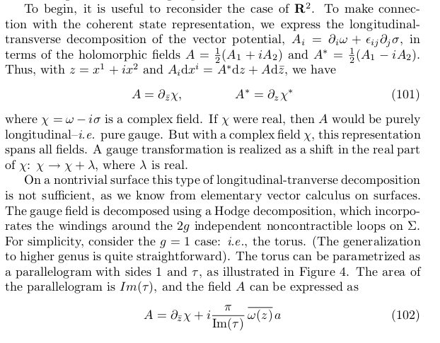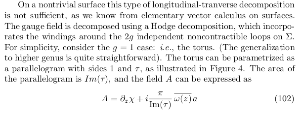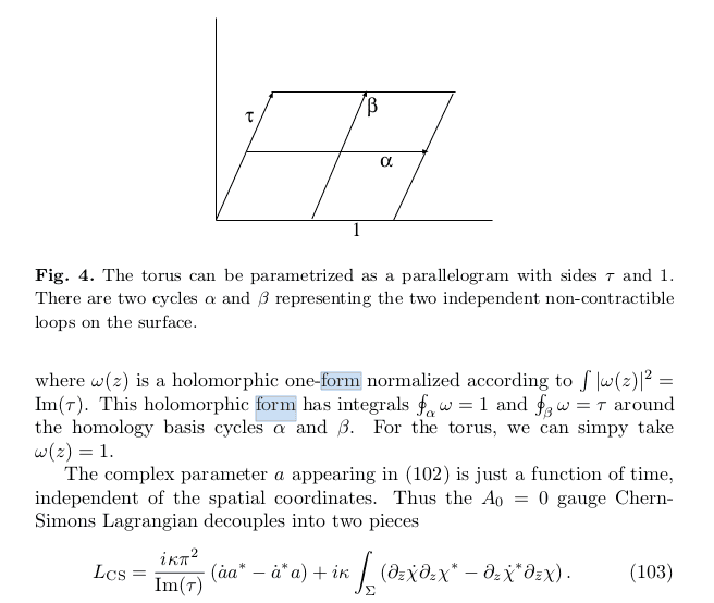 I was reading Dunne's review paper on Chern-Simons theory (Les-Houches School 1998) and I don't get how he decomposes the gauge potential on the torus. My own knowledge of differential geometry is sketchy. I do know that the Hodge decomposition theorem states that a differential form can be written as the sum of an exact, co-exact and harmonic form. But, I've only ever seen it as a one line result without proof in a mathematical methods book. I don't know anything about homologies either. If someone could at least point me towards a resource where I could learn how to derive the result I would be thankful. I have attached the section of the paper I'm having difficulty with.