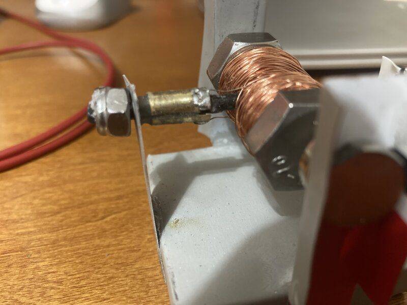 Here are the details. I started with a nut and bolt, and drilled a hole down the center of it. I inverted and glued into place a carbon fiber rod in the hole. I glued a bit on the end of the bolt. I wrapped magnet wire around the bolt on each side of the rod 400 times. I made a commutator using brass, and soldered one end of the wire to each side. The separation in the commutator is lined up the the bolt head and nut.