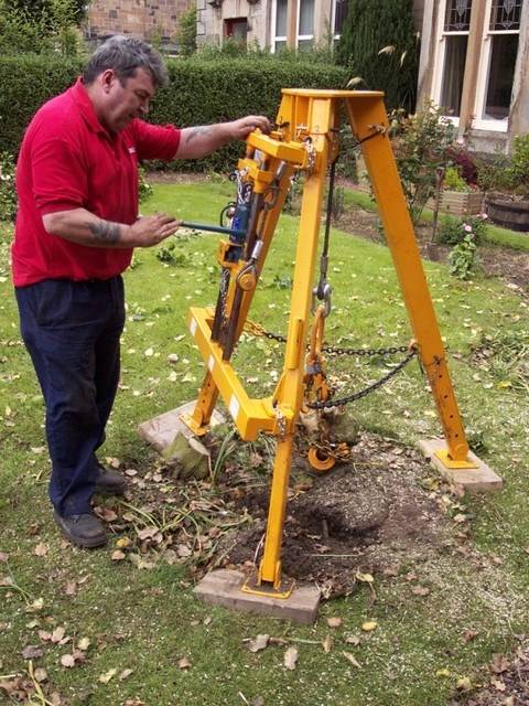 WHAT: I'm designing a simple tree stump puller. It consists of a tripod made of square (or round, if it's easier) steel tubing with a winch at the top. The cable from the winch drops down, attaches to the stump, then pulls the stump upward.