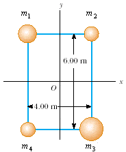 Four masses are held in position at the corners of a rectangle by light rods.Find the moment of inertia of the system about the x axis.Find the moment of inertia of the system about the y axis.Find the moment of inertia of the system about an axis through O and perpendicular to the page. M1 (kg) M2 (kg) M3 (kg) M4 (kg) the picture is attached.